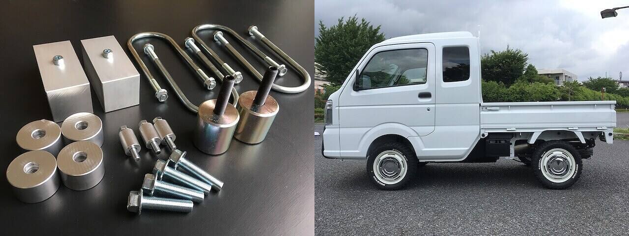 ・国内生産で品質が海外物とは違う・部品点数はあまりないが、リフトアップを気軽にできるキット・2インチ(5センチ)アップ・タイヤの外形の大きいものでさらに3センチは上がる(スーパーキャリーでも確認済)
